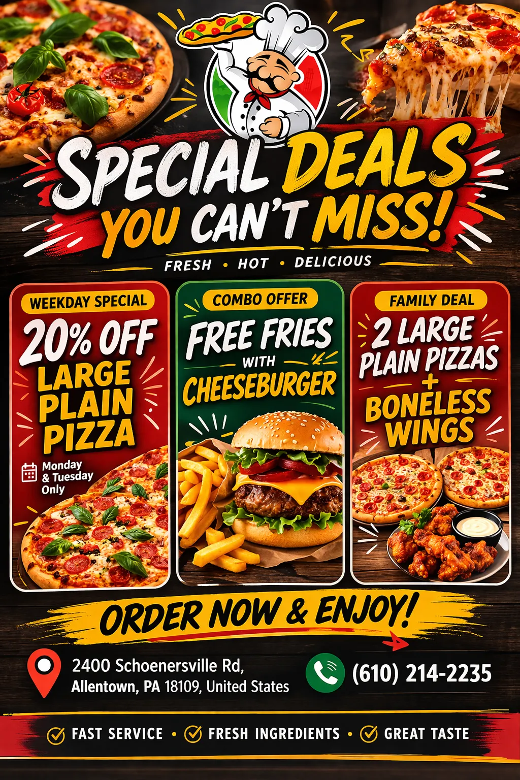 Our restaurant is located at 2400 Schoenersville Road, Allentown, PA, USA.